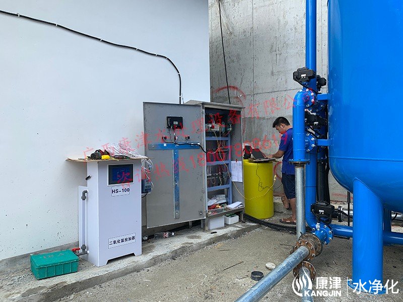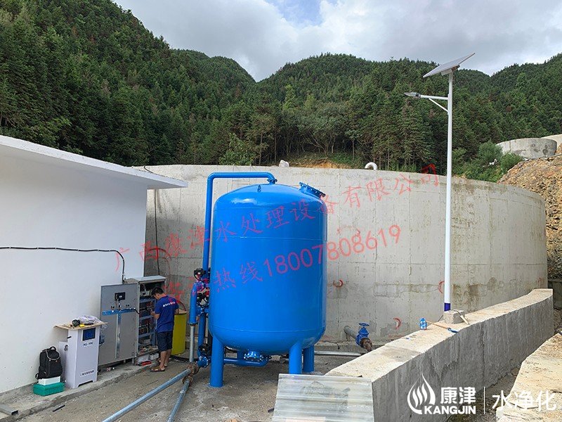 工藝流程:山泉水-絮凝投加器-石英砂過(guò)濾器-二氧化氯加藥器-用水點(diǎn)