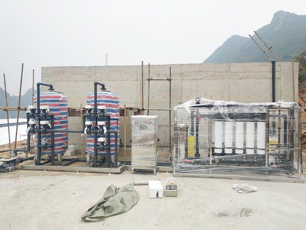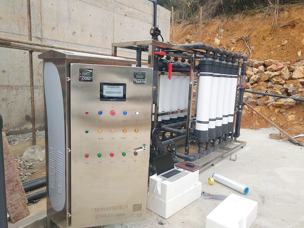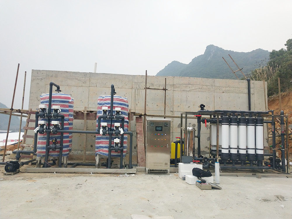 本方案主要針對原水為河水,以河水為飲用水源的地區,常常在雨季會遇到水質渾濁發黃問題。河水通常比較渾濁,水面漂浮臟東西、樹葉、水藻等,尤其在暴雨季節,水中泥沙量增加,雜質多,濁度、色度、氣味、細菌含量超標,因此必須使用專業凈水設備處理后才能達到生活飲用的目的。我們對河水的凈化主要是除去水中雜質,包括以下幾種:泥沙、大分子顆粒雜質、懸浮物、藻類、膠體,去除污染色度、異味、微生物、細菌、病毒等,有的源水會含有HCO、Ca 、SO 、Cl 、Na 、Mg 和K。為了將河水指標達到生活用水標準,通過康泉水處理 超濾設備進而得到凈化。康泉水處理為根據實際用途情況制定以下解決方案。用水人數大約在200至300人,用水處理量每小時約10-12噸。