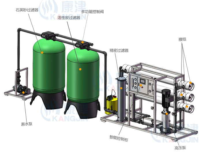 為保證關鍵設備,如:單反滲透裝置的長期可靠穩定運行,設置預處理系統,滿足反滲透膜(RO)進水指標:濁度<0.5NTU、SDI<4、余氯<0.1ppm。根據原水水質,預處理系統由原水水箱、原水泵、多介質過濾器、活性炭過濾器、軟化過濾器、保安過濾及相關輔助設備組成。