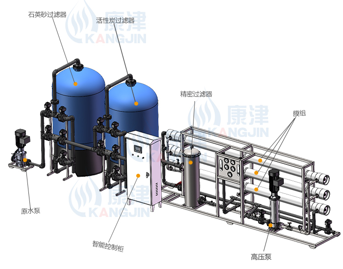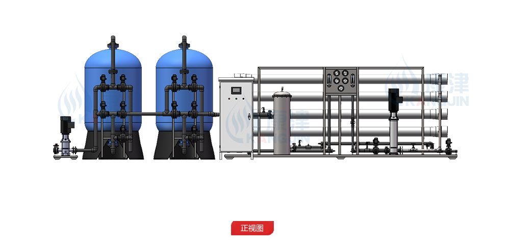 為保證關(guān)鍵設(shè)備,如:單反滲透裝置的長期可靠穩(wěn)定運行,設(shè)置預(yù)處理系統(tǒng),滿足反滲透膜(RO)進水指標(biāo):濁度<0.5NTU、SDI<4、余氯<0.1ppm。根據(jù)原水水質(zhì),預(yù)處理系統(tǒng)由原水水箱、原水泵、多介質(zhì)過濾器、活性炭過濾器、軟化過濾器、保安過濾及相關(guān)輔助設(shè)備組成。