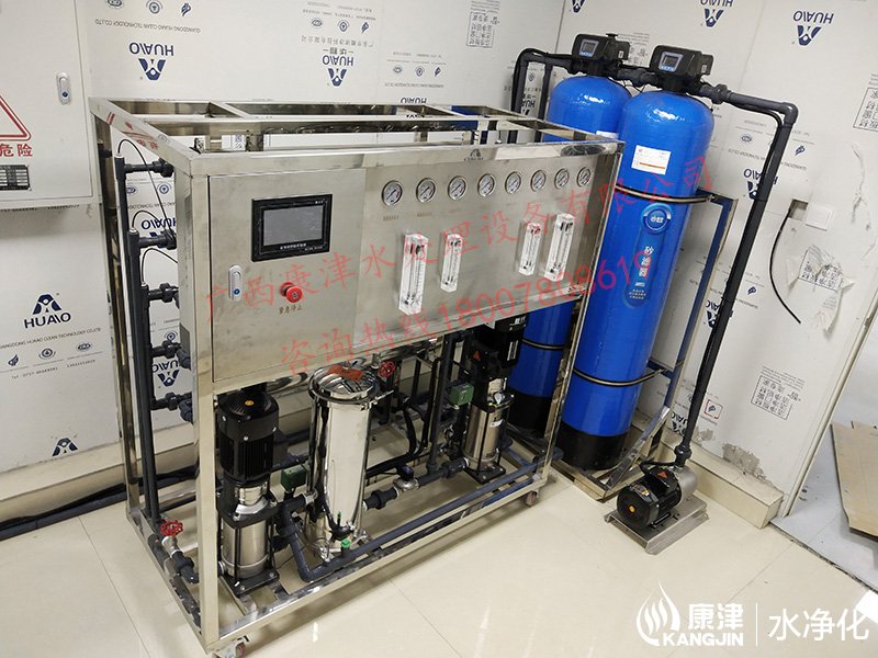 項目名稱:百色百東醫院0.5T雙級反滲透凈水設備 設備名稱:0.5噸雙級反滲透純化水設備 工藝流程:原水-原水泵-石英砂過濾器-活性炭過濾器-反滲透設備-精密過濾器-軟化水設備-凈水箱-變頻供水回水殺菌系統-用水點...