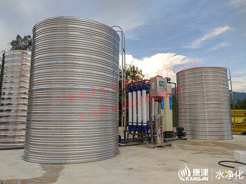 工藝流程:井水-原水箱-原水泵-石英砂過濾器-活性炭過濾器-精密過濾器-超濾設備-凈水箱